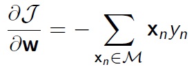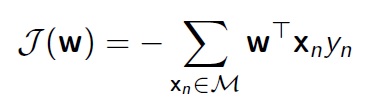 위와 같은 Objective function에 의해 Perceptron criterion이 최소화되는 방향으로 진행된다. 여기에서 M은 현재의 weight vector에 의해 잘못 분류된 데이터들을 모아놓은 set를 의미한다. Perceptron criterion이 최소화 되는 방향, 즉 J(w)의 기울기가 작아지는 방향으로 진행하게 된다.