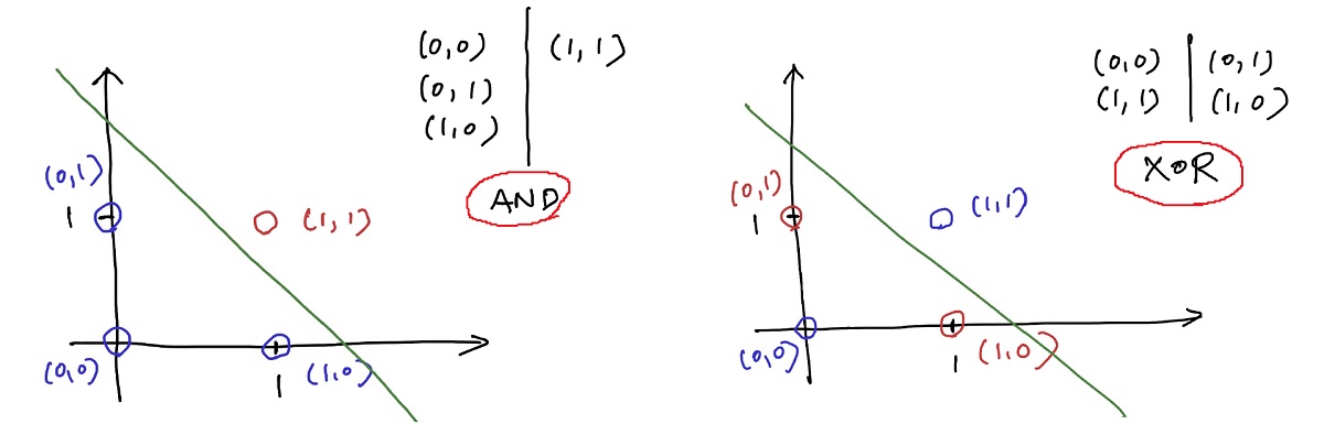 위와 같이 AND게이트의 경우 (Single)Linearly Separable 하기 때문에 Perceptron으로 분류할 수 있지만, XOR게이트의 경우 Perceptron으로 분류할 수 없다. 이는, MLP(Multi Layer Perceptron)을 통해 해결할 수 있지만, 한참 지난 1980년대에 와서야 발견되어 다시 신경망 연구가 부활하게 된다.