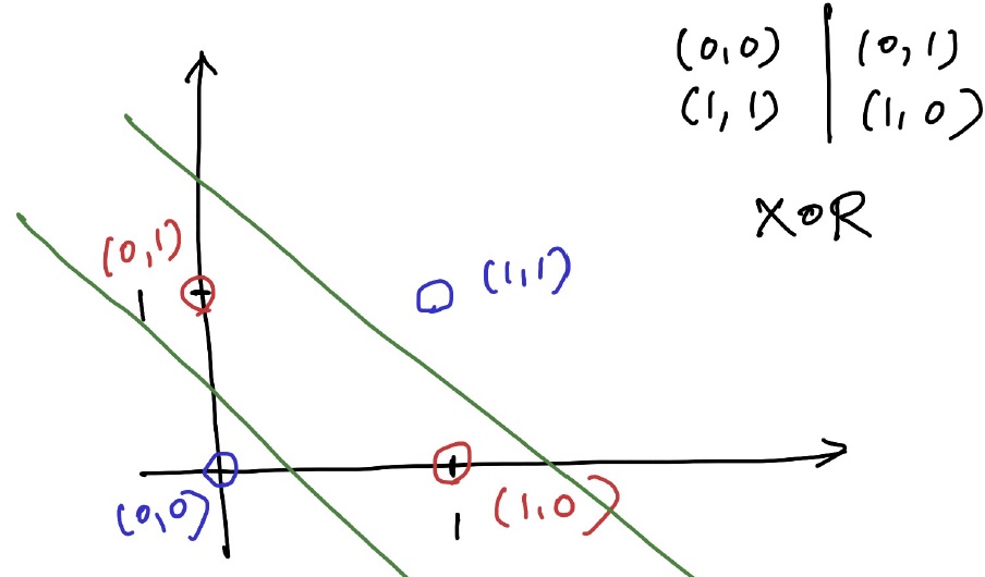 지난번 Perceptron이 XOR문제를 해결하지 못해 AI의 암흑기가 찾아왔다고 설명했다. 하지만, 이는 Layer를 여러개 쌓는 것으로 해결할 수 있다. 아래와 같이 두 개의 선으로 XOR을 분류할 수 있다.
