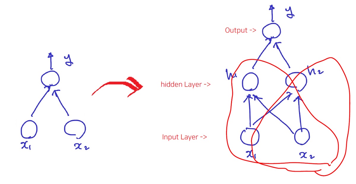 즉, 아래의 그림에서 기존의 Perceptron(왼쪽)에서 Hidden Layer를 더 쌓아서 오른쪽과 같이 진행하면 해결된다.