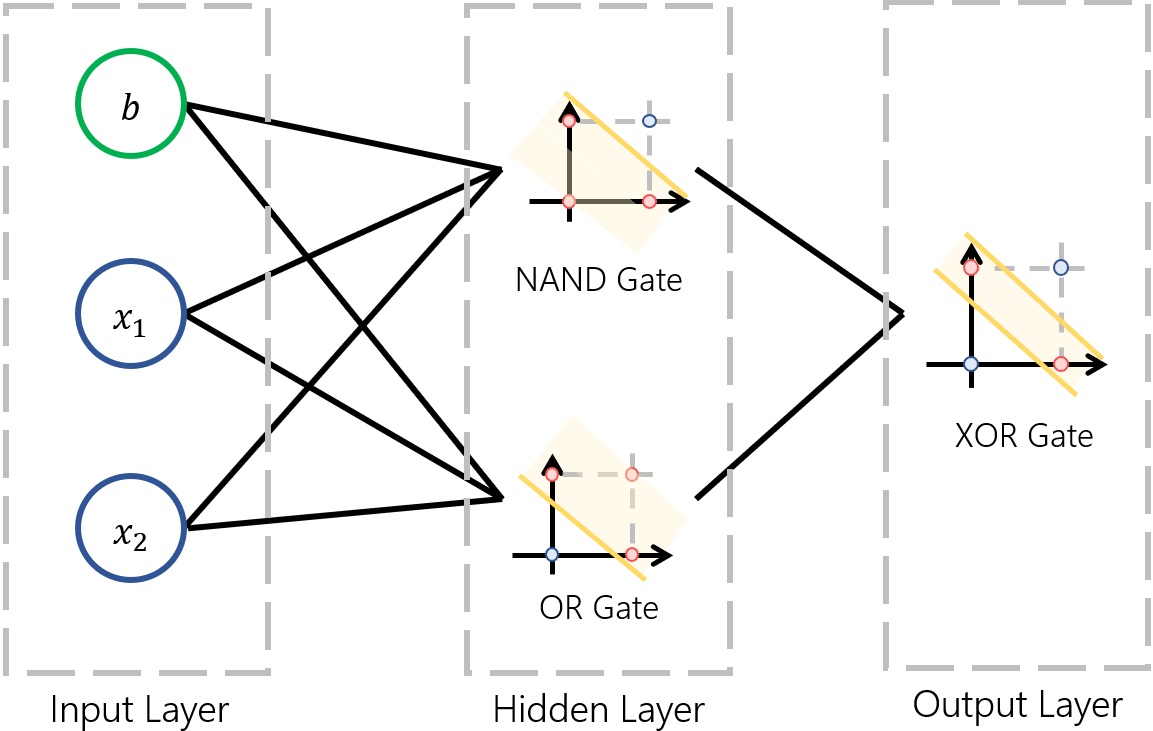 XOR 문제를 Hidden Layer를 써서 아래와 같이 풀어낼 수 있다.