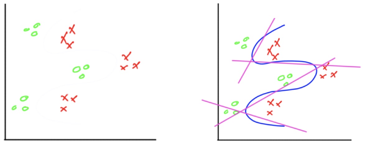 또 다른 예시를 통해 자세히 알아보자. 아래와 같은 데이터셋을 두개의 집단으로 분류한다고 하자. 이는 XOR과 같이 직선 두개로 해결할 수 없다. 올바르게 분류하기 위해선 오른쪽과 같이 4개의 직선을 이용하여 분류할 수 있다.
